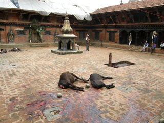昔の王宮広場では何頭もの水牛の首が刎ねられます。 神にささげた鶏や あひるが夜のご馳走となるわけです。ネパール最大の祭りダサインは満月 の夜終了します。 ← 首を刎ねられた水牛 |