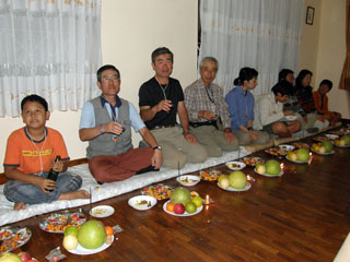 神への祈りの儀式があってそのあとダサインとあわせての宴会です。 誕生日の男の子に「おめでとう!いくつになったの?」とお祝いの気持ち をこめて尋ねました。すると父親が即座に「誕生日には年齢を聞いては いけないのです。明日聞いてください」と言うのです。 ネパールではそういうことなのでみなさんもご注意を…。 |