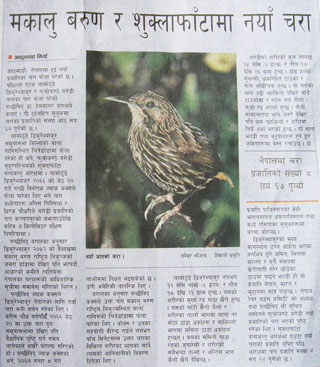 野鳥がネパール初記録として認められたという記事です。 ネパールで記録された野鳥は867種になったと述べています。日本の野鳥 が約600種とすれば、日本の半分にも満たない、なおかつ海のないところ で867種を記録したネパールはきわめて野鳥の多い国といえるでしょう。 右:ネパール初記録の野鳥を報じる新聞(10/14付け) |
