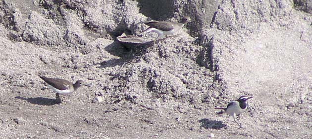 ![]() 川原にいた2羽のイソシギとオオハクセキレイ(右端) 11/28 オオハクセキレイはインド方面に生息するハクセキレイ の亜種で、日本特産のセグロセキレイによく似ている。 | |