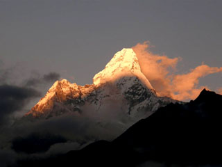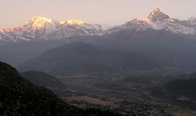 ![]() 夜明けのヒマラヤ 左アンナプルナ(8091m) 右マチャプチャレ(6997m) | |