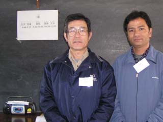 そこで分かったのですが、受験生にとって気の毒なのは“聴解”の試験です。教壇の小さなラジカセからテープの声が流れます。音を大きくするためどうしても声が割れてしまいます。加えて窓の外を車が通り、トラクターが通り、時には飛行機の爆音です。こんな中で彼らは試験を受けています。一人でも多くの合格者が生まれる事を祈らずにはいられません。 ←試験監督と聴解試験用ラジカセ |