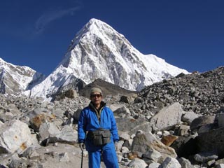頭の後ろの黒い三角形の頂がカラパタール5,545m 白い山はプモリ7,145m