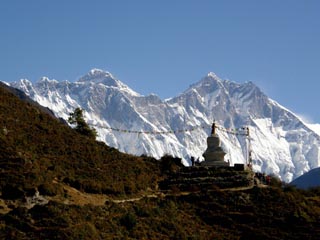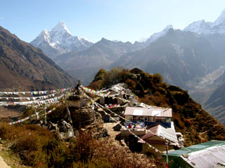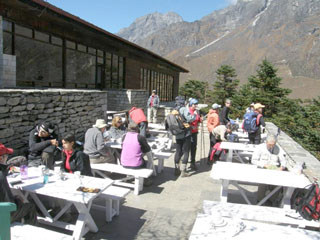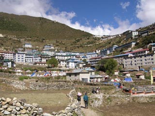| ナムチェバザールまでは勝手知ったる道のりです。ガイドはそこで探す予定で空港を出たのですが、そこでばったり去年のガイドと出会ってしまいました。これでは彼を雇わないわけにはいきません。これも何かの縁でしょうか。ガイド料1日1,000ルピー(1,300円)で手を打ちました。今年は円高で助かります。 | |