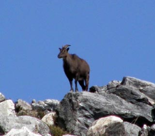 タンボチェ3,867mは見晴らしのよい尾根の上にあり、大きな僧院のあるシェルパ族の村です。ここか次のディンボチェ4,350mで、やはり2泊するようにと本にあります。前日ニジキジで味を占めた私としては同じように次の日は途中の村に泊まることにしました。4,000mを越えた所です。 ここでも幸運なことに野生のカモシカ、ヒマラヤタール Himalaya Tahrの群れを見ることができました。 |