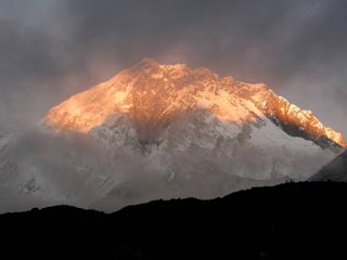 | ディンボチェ4,350mからクンブ氷河のほとりに出ると、まもなくロブチェ4,940mです。高山病の心配も少し遠のいたように思われます。トレッキング8日目の明日はいよいよカラパタール5,545mを往復するクライマックスを迎えます。ヌプツェ峰7,896m(写真)が夕日に染まっています。明日も天気はよさそうです。この日はシロボシマシコやムネアカイワヒバリを観察しました。 |