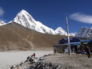 [10月18日] 今日も前日同様300mあまりの高度差をゴーキョ(4,750m)まで進みます。30分ほど行くとパンガの村です。1995年11月、ここで大きな雪崩が発生しました。日本人の登山隊および関係者25名と地元の人たちが巻き込まれて命を落としたということです。慰霊碑に黙祷し、先に進みました。 やがて湖が現れます。3つ目に一番大きな氷河湖が現れると、そのほとりがゴーキョです。湖の向こうにゴーキョピークに続く登山道が見えます。 | |
