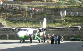 [10月14日] 数日前、霧深いルクラ空港で飛行機が着陸に失敗し、乗客乗員18名が死亡するという事故があったばかりでしたが、私たちは普段の行いのせいか、快晴のルクラ空港(2,804m)に降りたちました。 (写真:ルクラ空港 20人乗りプロペラ機) |