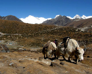 ゴーキョへの道 マッチェルモの村(左)を見下ろす峠でヤクに出会う 正面の山はチョーオユー8,201m