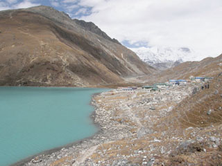 ![]() ドゥードゥ・ポカリのほとりにゴーキョ村 その向こうがンゴズンバ氷河 正面の山はチョラツェ6,440m |
