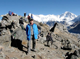 [10月19日] ルクラの空港を出発して6日目、いよいよゴーキョピーク(5,360m)登頂の日です。5時起床、暗い中ヘッドランプをつけての出発です。すぐに標高差600mの胸突き八丁です。 やがてヒマラヤの山々が朝日に輝きます。希薄な空気にあえぎながらも、2時間ほどで私たちは頂上に立ちました。 右写真:頂上にて うしろの山チョーオユー8,201mとギャチュンカン7,922m(右) |