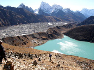 振り返ると氷河湖ドゥードゥポカリ(ポカリ=湖)が青く光っています。そのほとりがゴーキョの村、その向こうにンゴズンバ氷河がせり出しています。 目を転じると北にチョーオユー8,201m、ギャチュンカン7,922m、東にエベレスト8,842m、ローツェ8,516m、マカルー8,463mと8,000m級の山々が聳え立ち、思わず息を呑んでしまいます。 | |