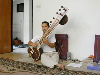 フクロウ君の近くに友人のシタール奏者サテンドラ君の家があります。探鳥の帰りに時々寄ってマンドリンの親分のような楽器を聞かせてもらっています。今年8月には日本にも演奏旅行に来た、目下売り出し中のミュージシャンです。「荒城の月」や「島歌」が好きだというので、去年CDをプレゼントしましたが、今年は早速それらの曲を聞かせてくれました。 写真:シタールを弾くサテンドラ氏 |