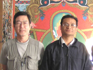 もう一人の友人は、画家のロクさんです。タンカ(仏画)の第一人者で、「地球の歩き方」にも紹介されました。彼は良家の子女が通う私立学校(幼稚園から中学校までの一貫校)で、絵を教えながらネパールのよき伝統や仏の心を教えています。この学校の校長先生は仏教徒で頭を丸めた尼僧です。なかなかの教育理念と信念をもった方とお見受けしました。 写真:画家のロクさん(右) |