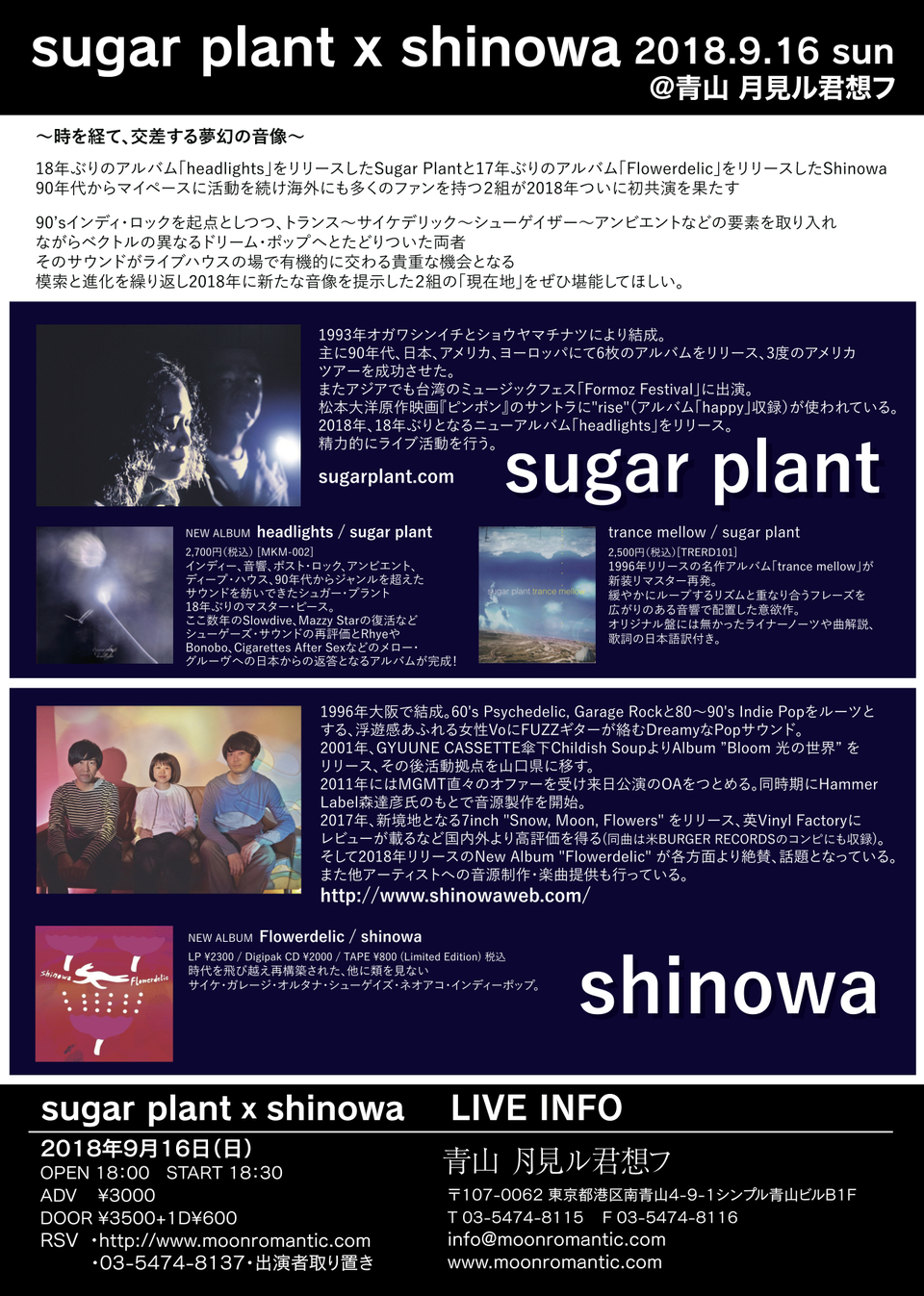 2018年、18年ぶりのアルバム「headlights」をリリースしたsugar plant と、17年ぶりのアルバム「Flowerdelic」をリリースしたShinowa。