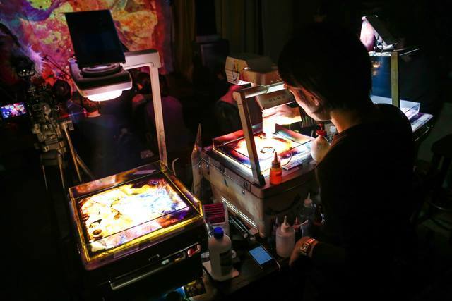 楽器を演奏をするかのように3台のOHPを同時に操りながら紡がれる光の絵は、絶えず変化し続け2度と同じにはならないその場限りの物語を描く。