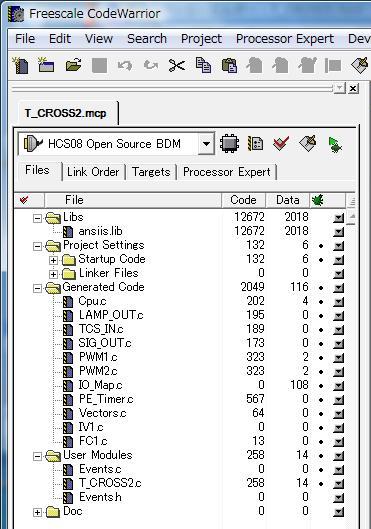 プロセッサーエキスパート(PE)で設定した結果、下図の様なソースファイルが生成されます。初期設定は全て完了していますのでMAIN関数の含まれているT_CROSS2.cのみを記述します。
