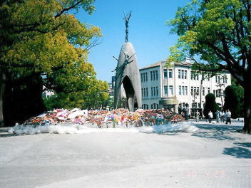 特にその中でも、原爆の子の像は、千羽鶴を折れば白血病が治ると信じて亡くなった人を悼んでで立てられた像で、たくさんの折鶴が備えられていて、人々の悲しみを誘う。 |
