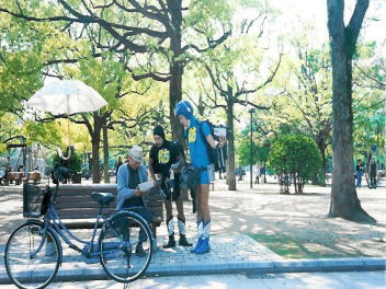 少しショックを受けた後、公園内にて今日これからのルートを地図で確認していると、人が集まっているのでいってみると、変わった服装の二人組がいた。そばで見ていた人に聞くと、TV番組電波少年の地球防衛軍だという。バイクのそばに来て広告塔になってくださいと言われて、バイクのバイザーのところに地球防衛軍のコンサートのポスターを貼られてしまった。仕方ないのでそのまま市内を走る。