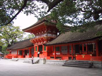 本殿は、これらの摂社以上に華やかで、檜皮葺の屋根と白壁、朱漆の柱が印象的な、八幡造りという様式の代表建造物で、国宝に指定されているという。 |