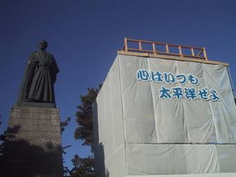 竜馬像の横に何か建設中のようで、白いキャンパス状の覆いの上に書かれた、心はいつも太平洋ぜよという言葉が、意味不明ながら印象的だった。