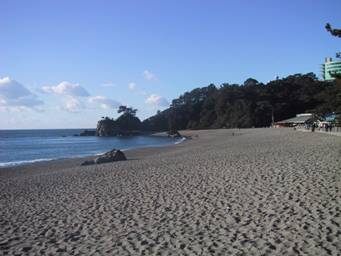 再びリアス式海岸の急コーナーを抜けると、うみがめの産卵で有名な大浜海岸に出た。