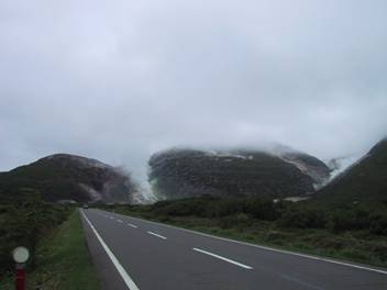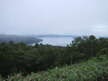峠を下ると、雲の間に屈斜路湖がみえた。