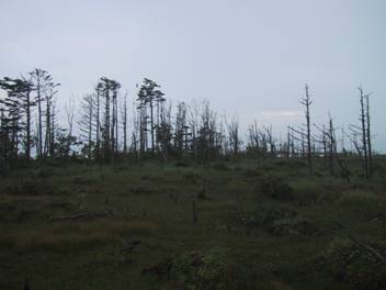 海水に浸食され、立ち枯れしたトド松が並んでいる。