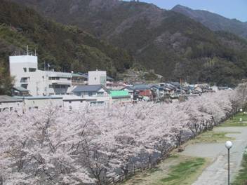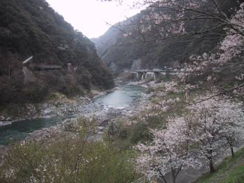 早い桜が満開で桜の色と、川の碧色と岩肌の白とのコントラストが見事だった。