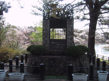 太宰治は、この公園で桜を眺めながら、友人達と酒を酌み交わし、楽しい一時を過ごしたという。 |