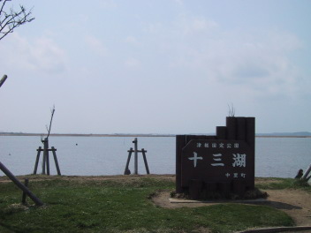 太宰治は、この十三湖のことを小説津軽で「浅い真珠貝に水を盛ったような、気品はあるがはかない感じの湖である。波一つない。船も浮んでいない。ひっそりしていて、そうして、なかなかひろい。人に捨てられた孤独の水たまりである。」と書いている。言い得て妙な表現だと思った。 |