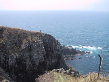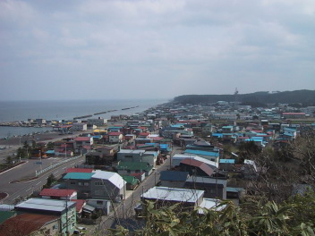 途中の眺瞰台より龍飛を眺瞰する。遠くのほうに、微かに北海道も見えた。 |