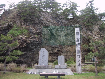 伝説では、源義経が衣川の舘から北へ逃げ延び、この地より蝦夷地へ渡ろうとしたが、海峡が荒れていたため渡れず、この岩の上で三日三晩祈った。すると白髪の老人が現れ、「3頭の龍馬がある。それに乗って渡るがいい」と言った。翌日、岩穴には3頭の竜馬がつながれ、この竜馬に乗って義経は、弁慶と亀井六郎の二人の郎党とともに、無事海峡を渡ったという。