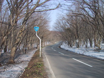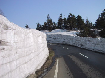 標高が高くなると、道路の両側に、雪が白い壁のように積もっている。