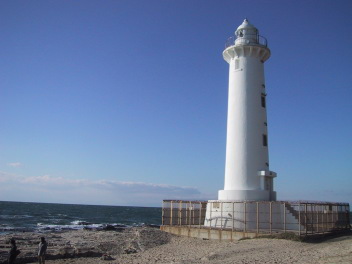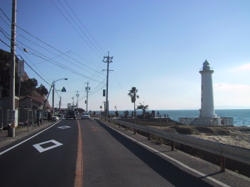 源義朝の最後の地と言われている野間大坊を過ぎると渋滞は無くなり、海沿いの道を走っていると、前方に小ぶりな灯台が見えた。