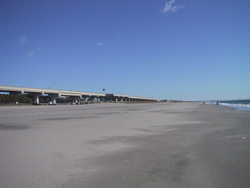 高速道路のような高架道路で、右手に遠州灘がいっぱい広がる。