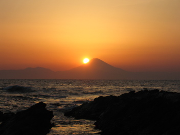 ちょうど夕暮れ時で、夕日が富士に沈んでいく。