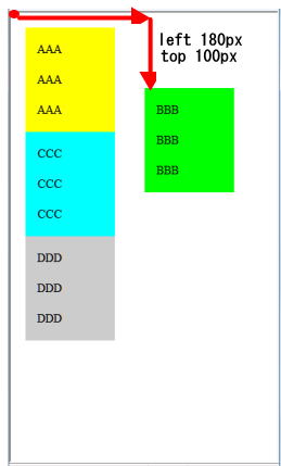 ① を relative、absolute、fixed に変更してボックス"b" がどのように表示されるかを見てみる。ボックス"b"は BBB の文字列でライム色の背景色で表示されます。