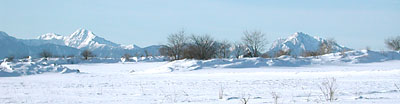 雨もやみ晴れてきた、朝7時すぎに着いたけど、びっくり、遠くの山々もごま塩のように白いけど、雪がグランドや林の中を薄く覆っていた。