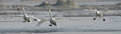 寒くなり、靴底ホカロンを敷いて待っているけど、期待のハクチョウは、2羽、3羽とバラバラ飛んで、いつのまにか餌場に来ている。まとめては飛ばないんだ。(^_^;)