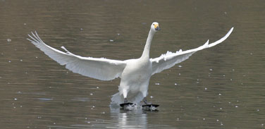 1羽のコハクチョウが潜ったり、足で川底の小石をひっくり返すと、それをまるく囲んでいたカモたちが一斉に潜る。カモたちは多分撒かれた餌を石の下から拾うのだと思う。何度も繰り返して、見ていておもしろい。そのコハクチョウはカモにもギャラリーにも大受けでした。(写真:コハクチョウの着水!)