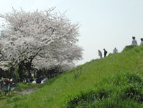 久々の多摩川。土手の下は桜の木が並び、満開を過ぎて時々花吹雪が舞う。 暖かく、行き交う人ものんびり花を楽しんでいる様子。