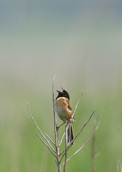 コヨシキリや、オオセッカ(写真:右下)、コジュリン(写真:左下)の声を聞きに!ということで、笹川に6時に着いた。広い芦原のあちこちで盛んにさえずっている。オオセッカは高く舞い上がり、失速するように落ち、オオヨシキリ、コヨシキリはずっと同じところで、セッカは広く飛び回って、コジュリンは、時々移動しながら、みんな思い思いに自己主張していた。朝は日差しがあって暑かったが、だんだん雲が広がり、風が涼しくなる。のんびりと見ていると、ヨシゴイが2羽水辺の近くに降りた、今季初、オイオイという鳴き声がなつかしい〜。ゆったりとアオサギやコサギ、ゴイサギ、アマサギも飛ぶ。