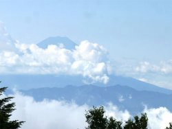 稜線に出ると、雲を巻き付けた青い富士山が見えた。(写真)