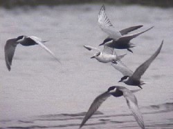 ○クロハラアジサシ 5羽(午前7時半頃に、5羽の群が通称貝殻島付近で採餌行動を取っているのを見つけた。その後、2〜3羽が堤防内水面を採餌しながら移動して潮干狩り場の棒杭に休止したり、アジサシ群中で休息したりした。全て成鳥夏羽個体であった)