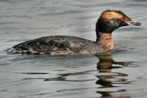 ○ミミカイツブリ 1羽(東西渚間水路。冬羽から夏羽への換羽が進行中であった)