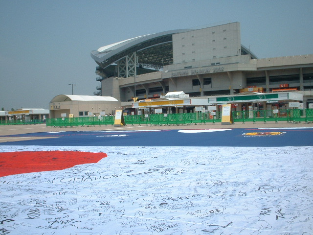 | 2002年6月4日。この日ここ埼玉スタジアム2002で行われる2002FIFAワールドカップKOREA JAPAN 日本代表のリーグ戦初戦となる「日本VSベルギー」が行われました。この試合で日本代表は 2−2の引き分けで、史上初となる、勝ち点1をゲットしました。 ということでこの当日、午前中に会場に行ってみました。この日は交通規制が厳しいので、 身軽に移動ができるように、自転車でこの会場まで行ってきました。 「自宅から自転車でワールドカップの会場入り」という、なかなかできない経験を させてもらいました。 たぶん、この後、この経験は2度とありそうにないので、いい想い出です(苦笑)。 ということで、この写真はサポーターの方によって、かなり大きな代表ユニフォーム& 「サポーター魂」がこもった、日の丸が敷きつめられました。かなり大きくて、フレームに 収まりませんでした。これを目の当たりにして、感動いたしました。 |