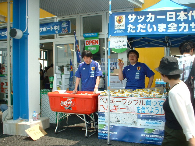 浦和美園駅前のコンビニの様子です。 グッズがたくさん売っていました。 ベルギー戦ということもあって、お約束の「ベルギーワッフル」が販売されていました。 |