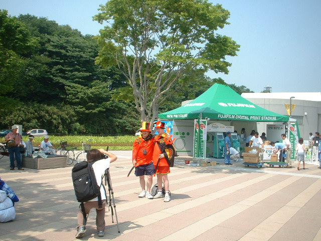 日本サポーターのみならず、はるばるベルギーからお見えになったベルギーサポーターも今日は ここで応援です。 「フーリガン」とかかなり騒がれる外国からのサポーターですが、実際、会場に行ってみると、 みんなとても楽しんでいて、陽気なかんじで、いい感じでした。この赤と黄色と黒が とても色鮮やかでした。 地元ベルギーでもこんなかんじで楽しんでいるんでしょうね。 |