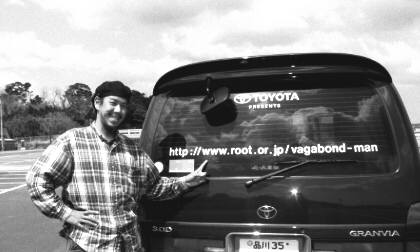 Vagabond-manこと竹村純二さんは、現在、トヨタの1.5ボックスワゴン・グランビアにMacintosh Powerbook 5300cを積んで、365日日本一周の旅の真っ最中。北海道から沖縄まで、名所旧跡を訪ね、おいしい物を食べるだけではんく、北陸の重油流出事故の時には、ボランティアとして駆けつけるなど、その模様はインターネットのホームページで詳細にレポートされてきた。96年5月20日にスタートして、ゴールを間近にしたバガボンドマンに会いに、3月27日、大分空港に飛んだ。